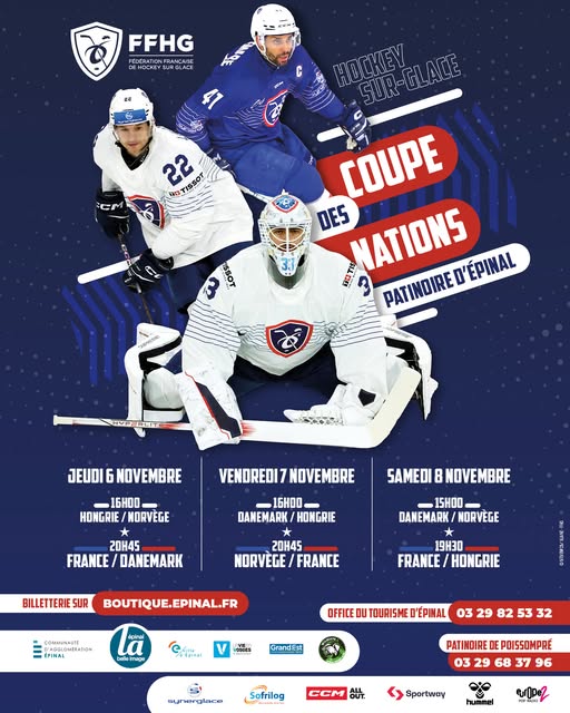 #EquipementSportif | 𝐂𝐨𝐮𝐩𝐞 𝐄𝐮𝐫𝐨𝐩𝐞́𝐞𝐧𝐧𝐞 𝐝𝐞𝐬 𝐍𝐚𝐭𝐢𝐨𝐧𝐬 🏒 Venez encourager l'Equipe de France de Hockey sur Glace à la Patinoire d'Épinal du jeudi 6 au samedi 8 novembre à l'occasion de la 𝐂𝐨𝐮𝐩𝐞 𝐄𝐮𝐫𝐨𝐩𝐞́𝐞𝐧𝐧𝐞 𝐝𝐞𝐬 𝐍𝐚𝐭𝐢𝐨𝐧𝐬. 𝐉𝐞𝐮𝐝𝐢 𝟔 𝐧𝐨𝐯𝐞𝐦𝐛𝐫𝐞 🇫🇷 🇩🇰 20h45 – France / Danemark 𝐕𝐞𝐧𝐝𝐫𝐞𝐝𝐢 𝟕 𝐧𝐨𝐯𝐞𝐦𝐛𝐫𝐞 🇫🇷 🇳🇴…