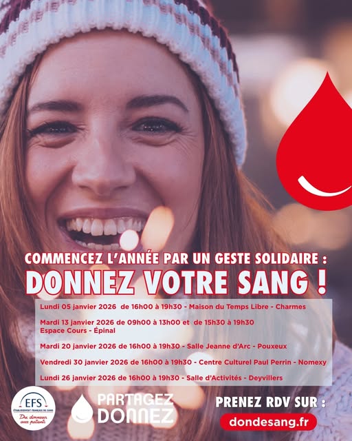 #DonDeSang | 𝐂𝐨𝐦𝐦𝐞𝐧𝐜𝐞𝐳 𝐥’𝐚𝐧𝐧𝐞́𝐞 𝐩𝐚𝐫 𝐮𝐧 𝐠𝐞𝐬𝐭𝐞 𝐬𝐨𝐥𝐢𝐝𝐚𝐢𝐫𝐞 !🩸 L'Etablissement Français du Sang Grand Est, en partenariat avec l’Association des Donneurs de Sang Bénévoles, organise plusieurs collectes de sang au mois de 𝐣𝐚𝐧𝐯𝐢𝐞𝐫 𝟐𝟎𝟐𝟔. À vos agendas : 📍 𝐂𝐡𝐚𝐫𝐦𝐞𝐬 🗓️ Lundi 5 janvier 2026 ⏰ 16h00 – 19h30 🏛️…